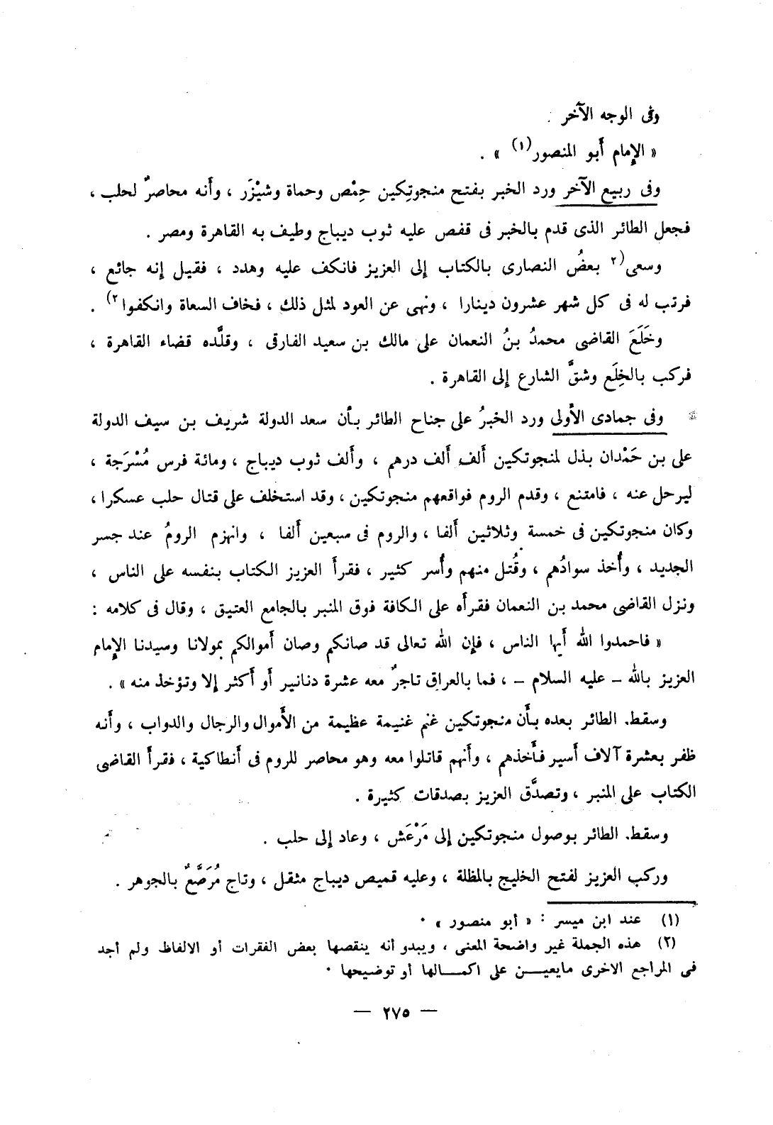 وفي جمادى الأولى ورد الخبر على جناح الطائر بأن سعد الدولة شريف بن سيف الدولة على بن حمدان بذل لمنجوتكين ألف ألف درهم، وألف ثوب ديباج، ومائة فرس مسرجة، ليرحل عنه، فامتنع، وقدم الروم فواقعهم منجوتكين، وقد استخلف على قتال حلب عسكرا، وكان منجوتكين في خمسة وثلاثين ألفا، والروم في سبعين ألفا، وانهزم الروم عند جسر الجديد، وأخذ سوادهم، وقتل منهم وأسر كثير، فقرأ العزيز الكتاب بنفسه على الناس، ونزل القاضي محمد بن النعمان فقرأه على الكافة فوق المنبر بالجامع العتيق، وقال في كلامه: فاحمدوا الله أيها الناس، فإن الله تعالى قد صانكم وصان أموالكم بمولانا وسيدنا الإمام العزيز بالله عليه السلام، فما بالعراق تاجر معه عشرة دنانير أو أكثر إلا وتؤخذ منه.