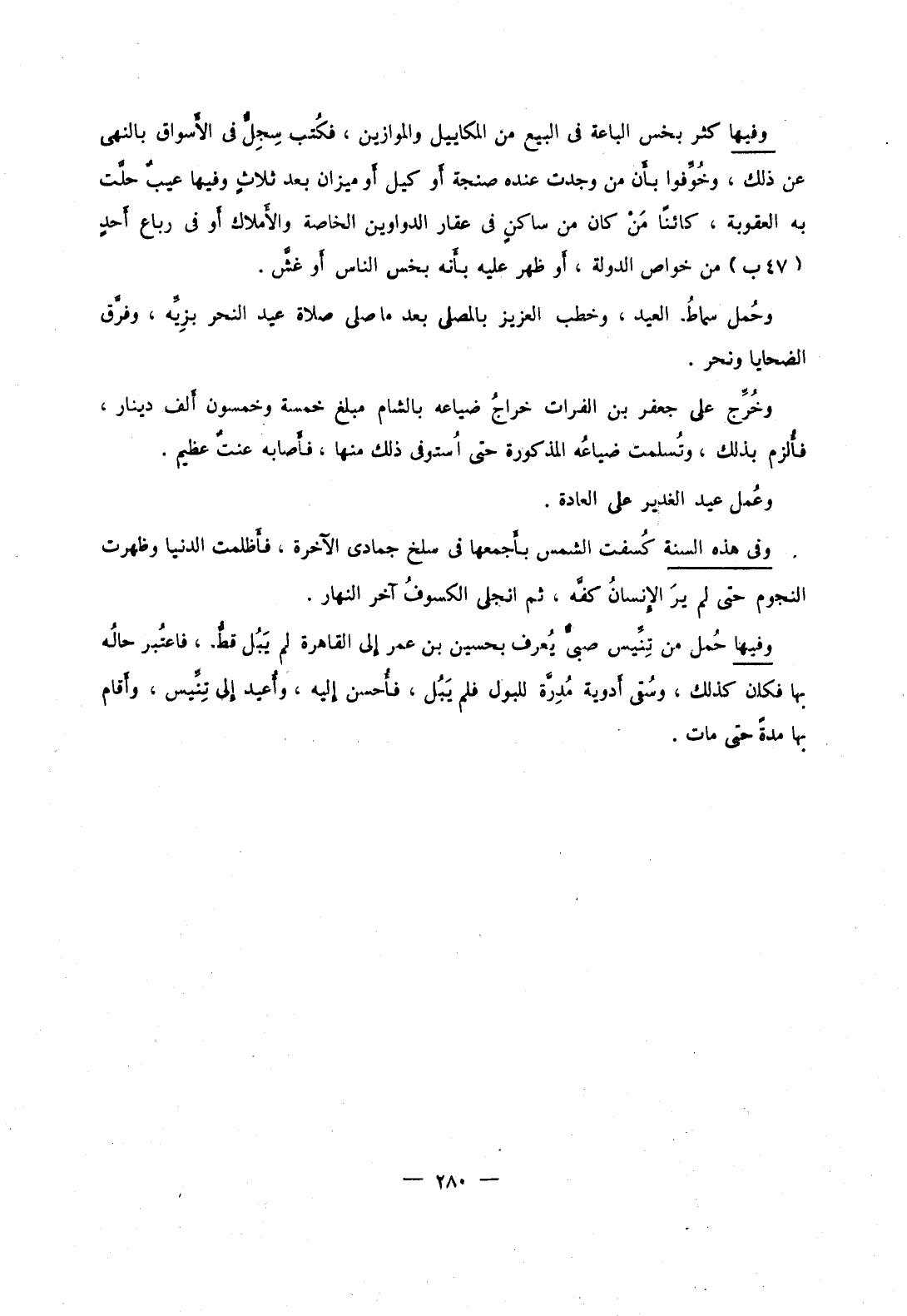 وفيها كثر بخس الباعة في البيع من المكاييل والموازين، فكتب سجل في الأسواق بالنهي عن ذلك، وخوفوا بأن من وجدت عنده صنجة أو كيل أو ميزان بعد ثلاث وفيها عيب حلت به العقوبة، كائناً من كان من ساكن في عقار الدواوين الخاصة والأملاك أو في رباع أحد من خواص الدولة، أو ظهر عليه بأنه بخس الناس أو غش.