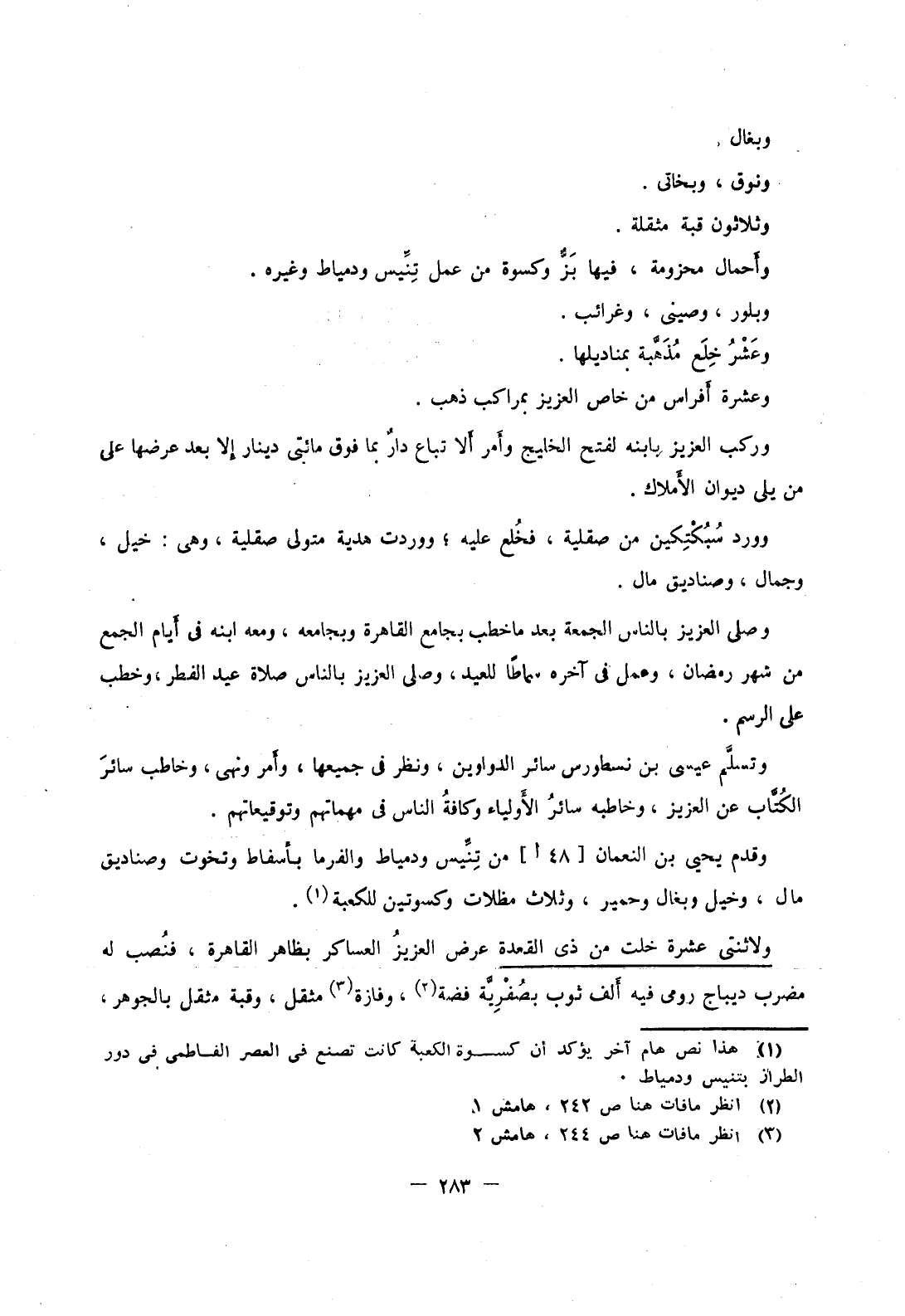 ولاثنتي عشرة خلت من ذي القعدة عرض العزيز العساكر بظاهر القاهرة، فنصب له مضرب ديباج رومي فيه ألف ثوب بصفرية فضة، وفازة مثقل، وقبة مثقل بالجوهر،