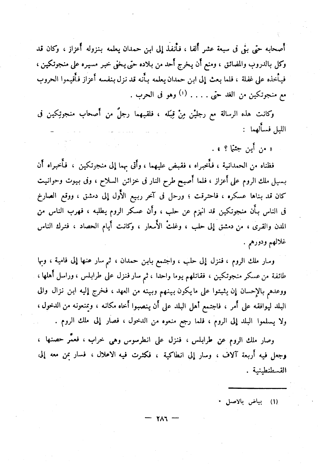 أصحابه حتى بقى في سبعة عشر ألفا، فأنفذ إلى ابن حمدان يعلمه بنزوله أعزاز، وكان قد وكل بالدروب والمضائق، ومنع أن يخرج أحد من بلاده حتى يخفى خبر مسيره على منجوتكين، فيأخذه على غفلة، فلما بعث إلى ابن حمدان يعلمه بأنه قد نزل بنفسه أعزاز فأقيموا الحروب مع منجوتكين من الغد حتى.... وهو في الحروب.