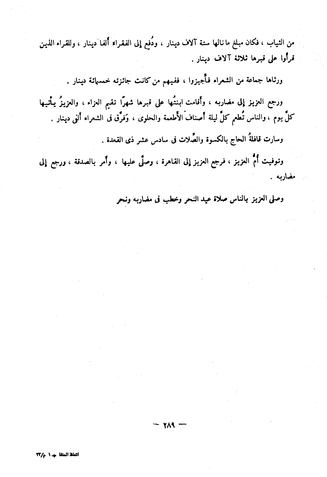 وتوفيت أم العزيز، فرجع العزيز إلى القاهرة، وصلى عليها، وأمر بالصدقة، ورجع إلى مضاربه.