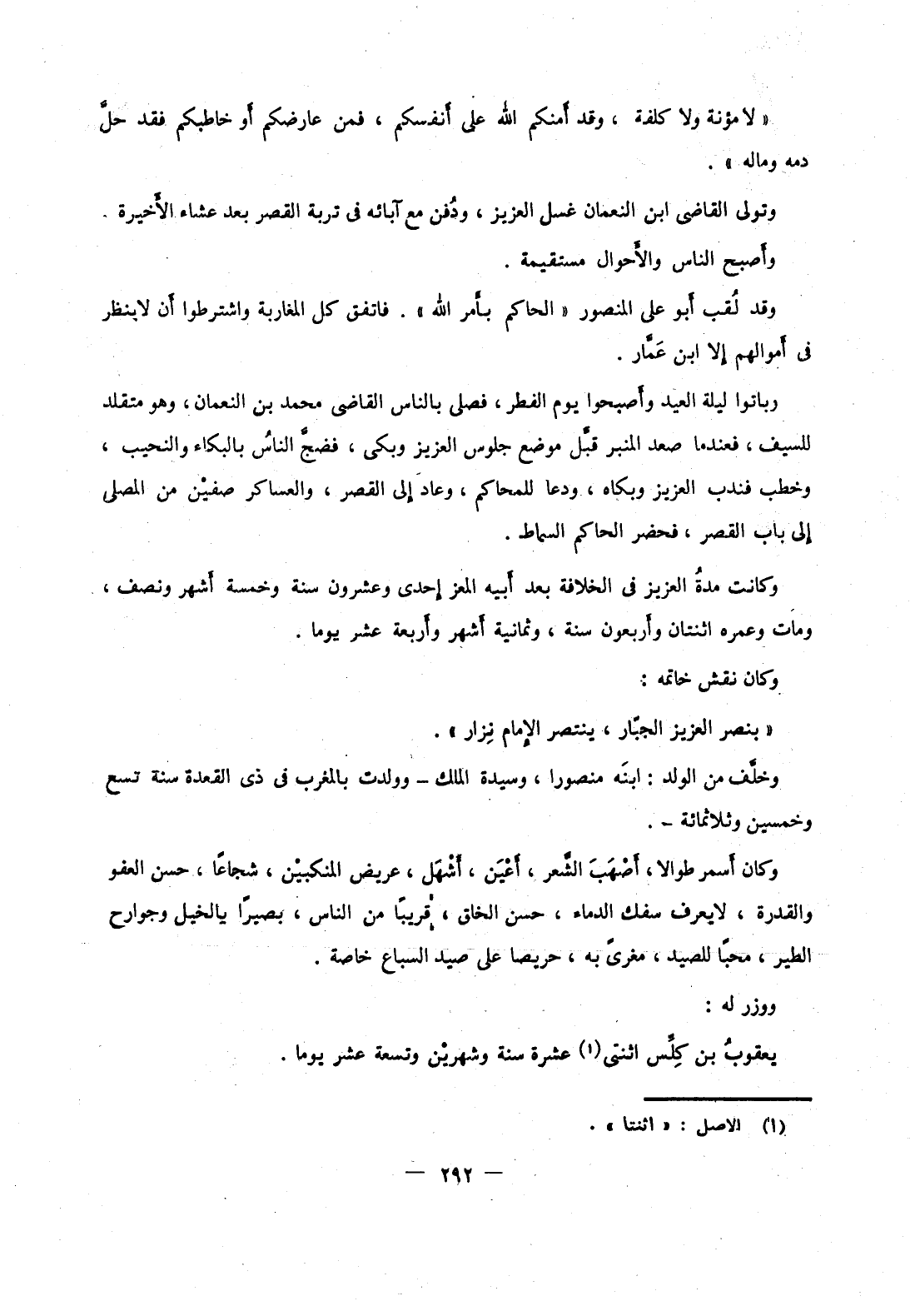 ووزر له: يعقوب بن كلس اثنتي عشرة سنة وشهرين وتسعة عشر يوما.