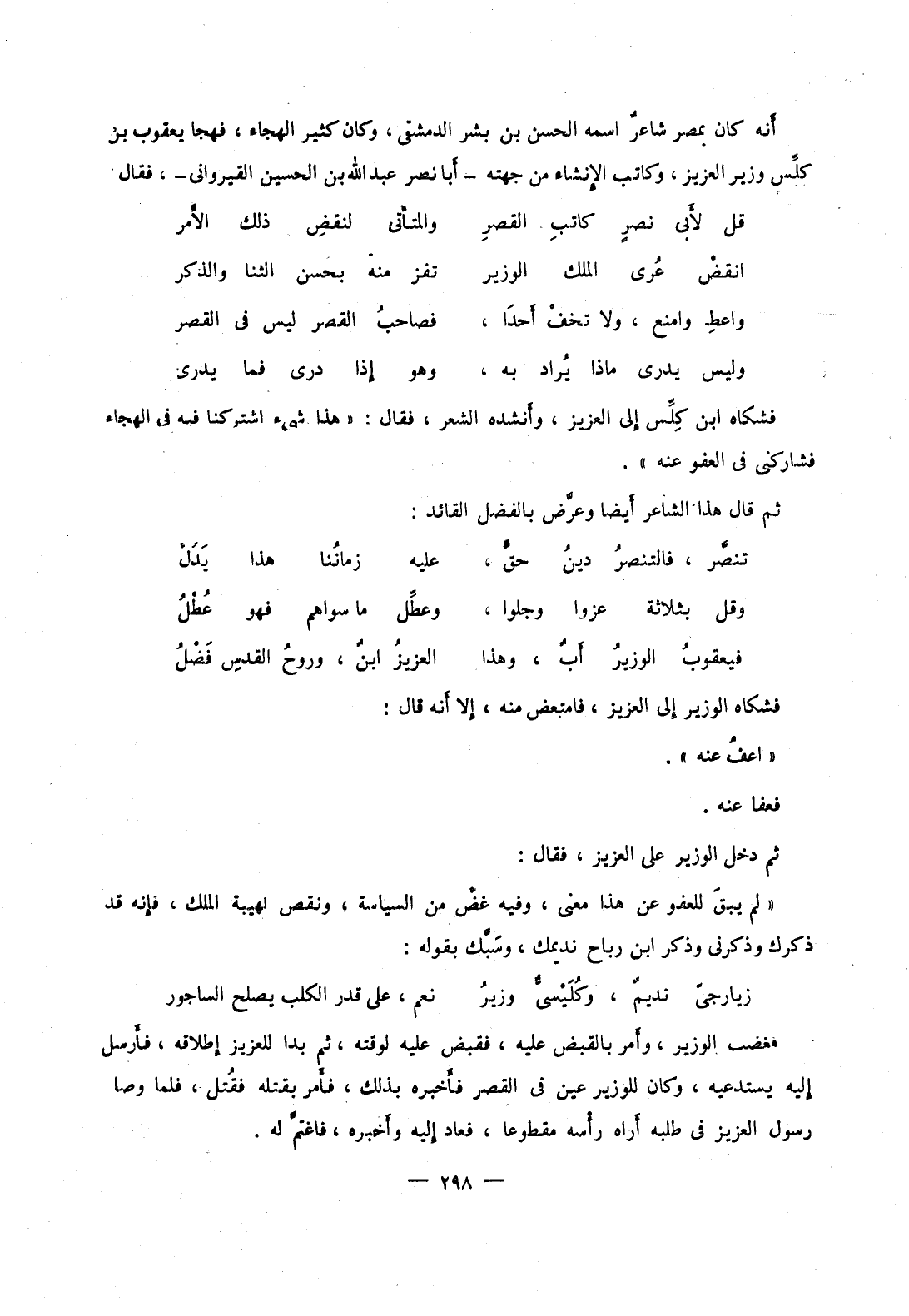 أنه كان بمصر شاعر اسمه الحسن بن بشر الدمشقي، وكان كثير الهجاء، فهجا يعقوب بن كلس وزير العزيز، وكاتب الإنشاء من جهته أبا نصر عبد الله بن الحسين القيرواني، فقال: