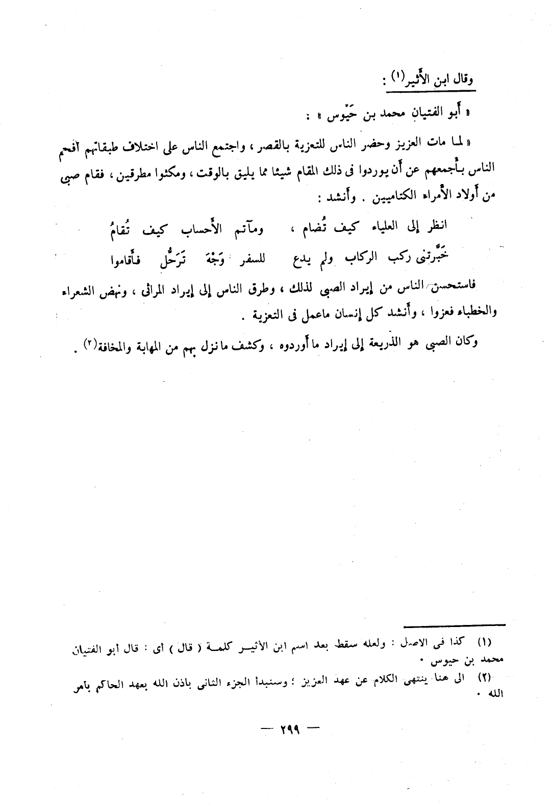 وقال ابن الأثير: أبو الفتيان محمد بن حيوس: لما مات العزيز وحضر الناس للتعزية بالقصر، واجتمع الناس على اختلاف طبقاتهم افحم الناس بأجمعهم عن أن يوردوا في ذلك المقام شيئا مما يليق بالوقت، ومكثوا مطرقين، فقام صبي من أولاد الأمراء الكتاميين. وأنشد: