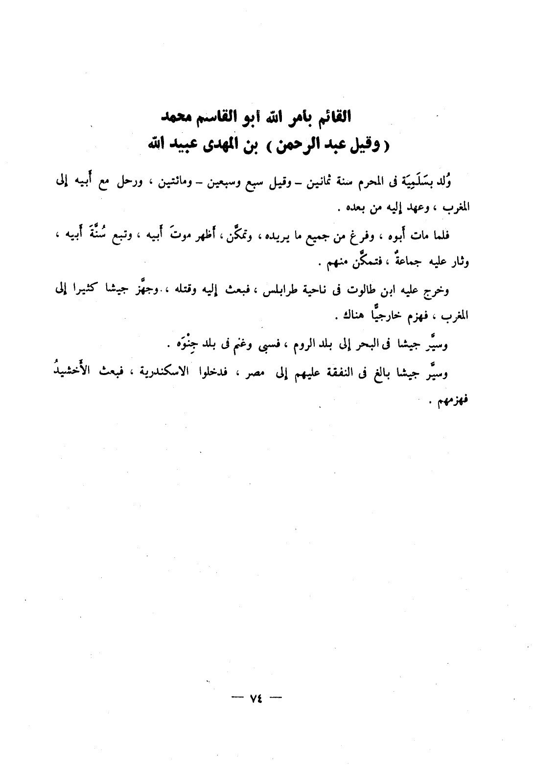 ولد بسلمية في المحرم سنة ثمانين وقيل سبع وسبعين ومائتين، ورحل مع أبيه إلى المغرب، وعهد إليه من بعده.