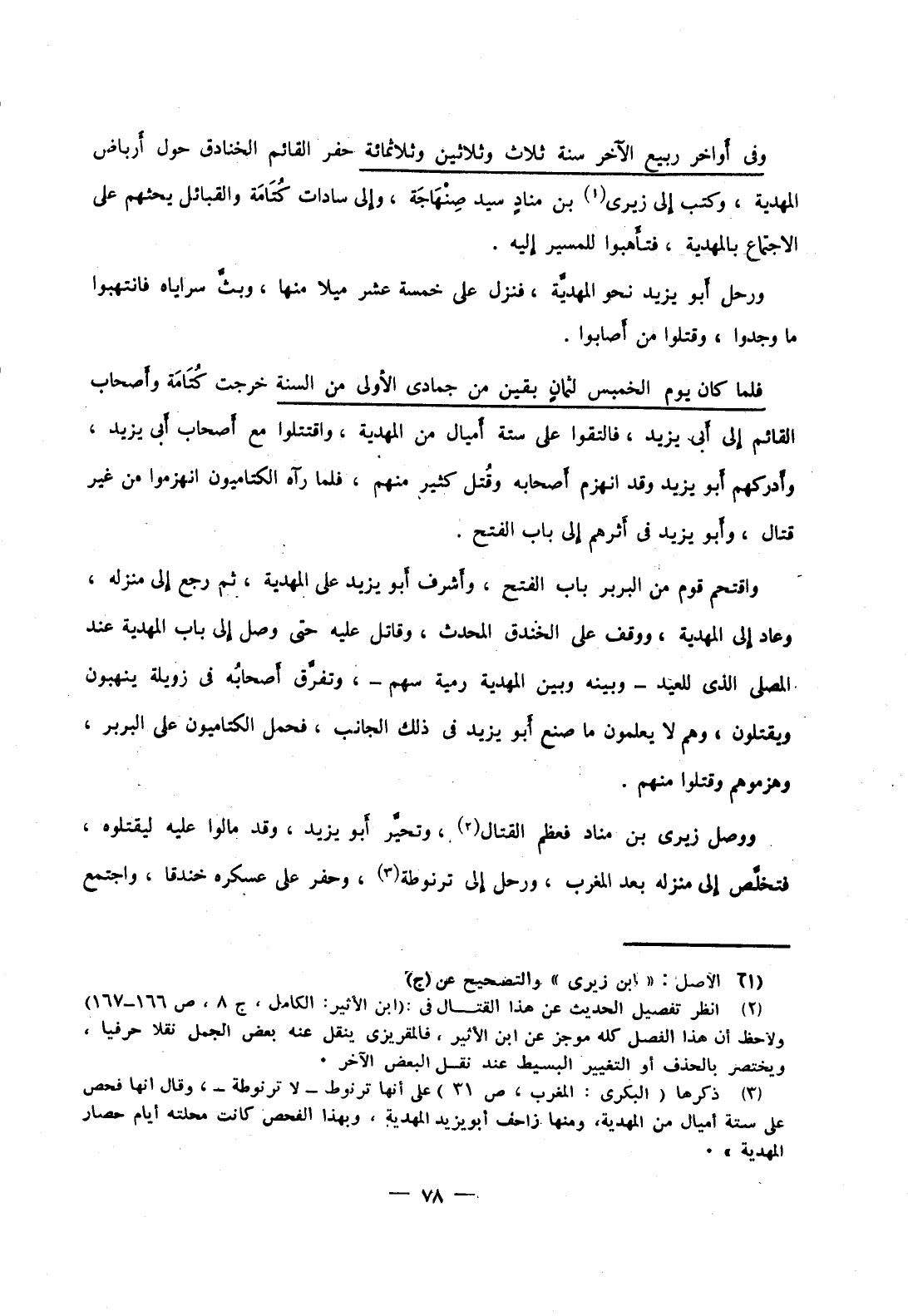 واقتحم قوم من البربر باب الفتح، وأشرف أبو يزيد على المهدية، ثم رجع إلى منزله، وعاد إلى المهدية، ووقف على الخندق المحدث، وقاتل عليه حتى وصل إلى باب المهدية عند المصلى الذي للعيد وبينه وبين المهدية رمية سهم، وتفرق أصحابه في زويلة ينهبون ويقتلون، وهم لا يعلمون ما صنع أبو يزيد في ذلك الجانب، فحمل الكتاميون على البربر، وهزموهم وقتلوا منهم.
