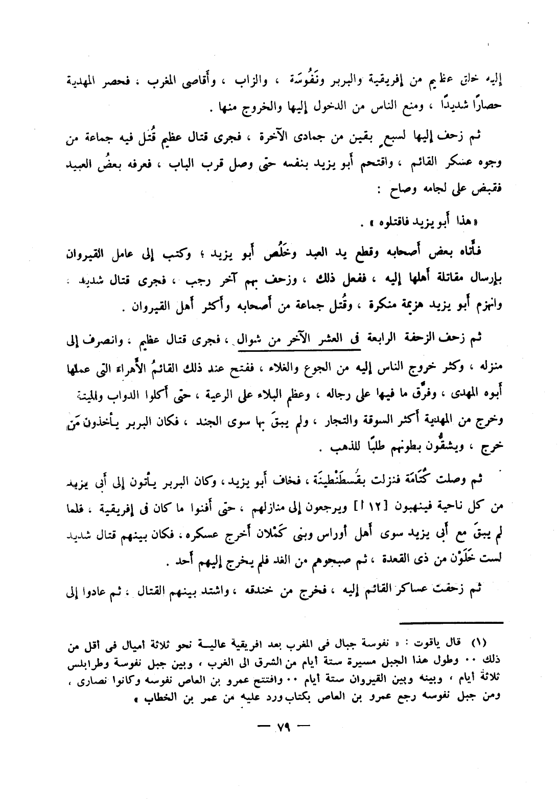 فأتاه بعض أصحابه وقطع يد العبد وخلص أبو يزيد؛ وكتب إلى عامل القيروان بإرسال مقاتلة أهلها إليه، ففعل ذلك، وزحف بهم آخر رجب، فجرى قتال شديد، وانهزم أبو يزيد هزيمة منكرة، وقتل جماعة من أصحابه وأكثر أهل القيروان.