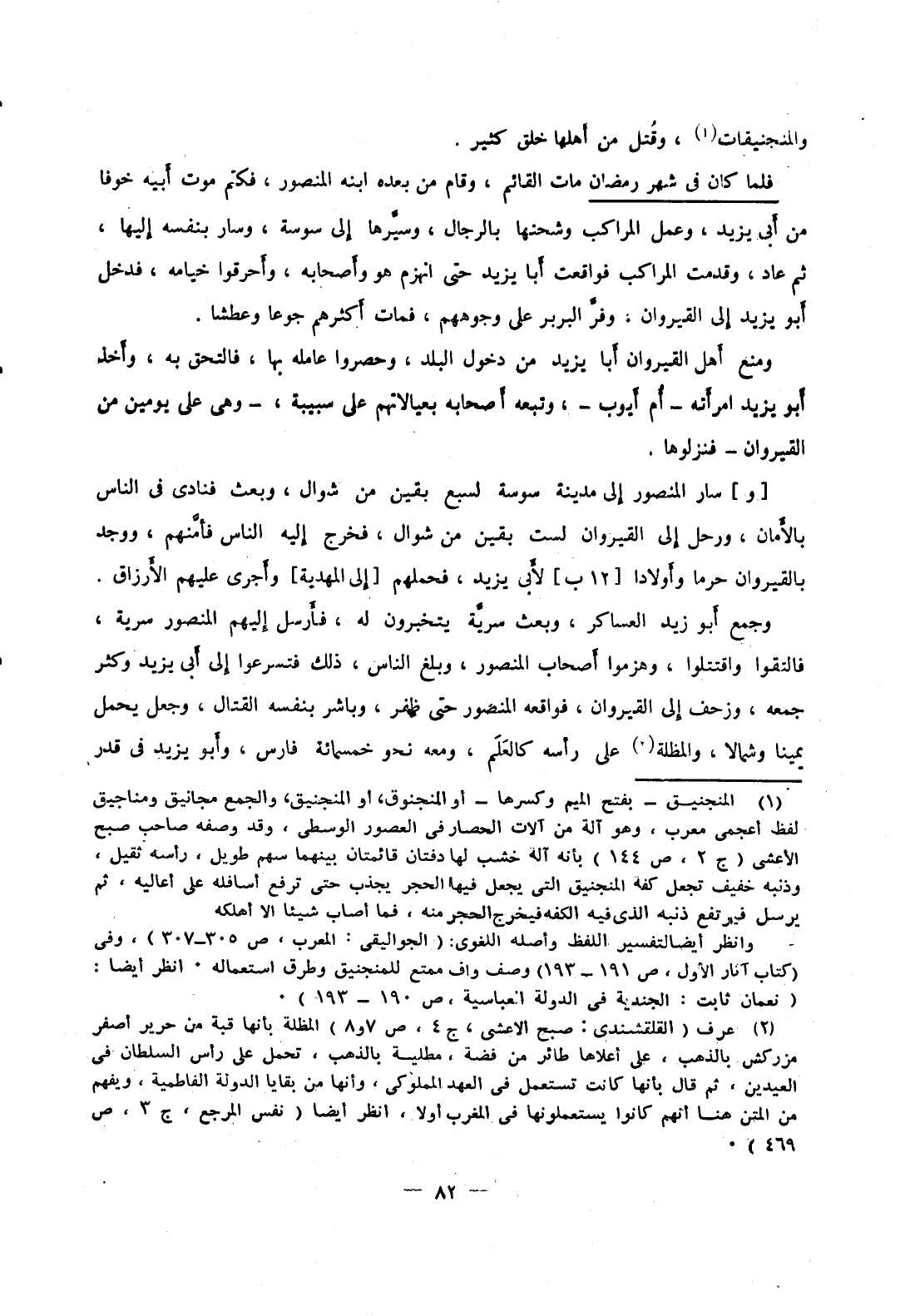 وجمع أبو زيد العساكر، وبعث سرية يتخبرون له، فأرسل إليهم المنصور سرية، فالتقوا واقتتلوا، وهزموا أصحاب المنصور، وبلغ الناس، ذلك فتسرعوا إلى أبي يزيد وكثر جمعه، وزحف إلى القيروان، فواقعه المنصور حتى ظفر، وباشر بنفسه القتال، وجعل يحمل يمينا وشمالا، والمظلة على رأسه كالعلم، ومعه نحو خمسمائة فارس، وأبو يزيد في قدر