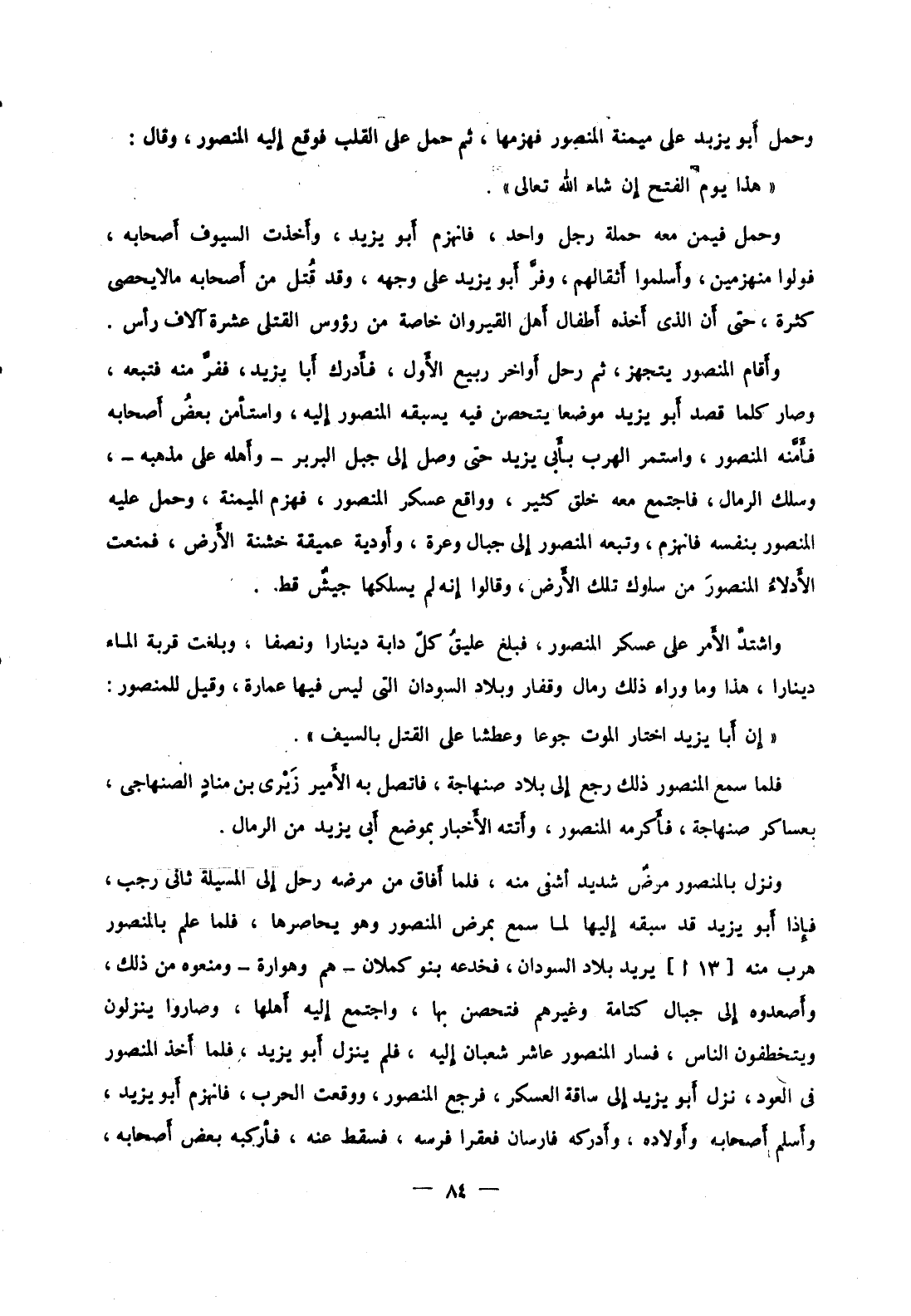 وحمل أبو يزيد على ميمنة المنصور فهزمها، ثم حمل على القلب فوقع إليه المنصور، وقال: هذا يوم الفتح إن شاء الله تعالى.
