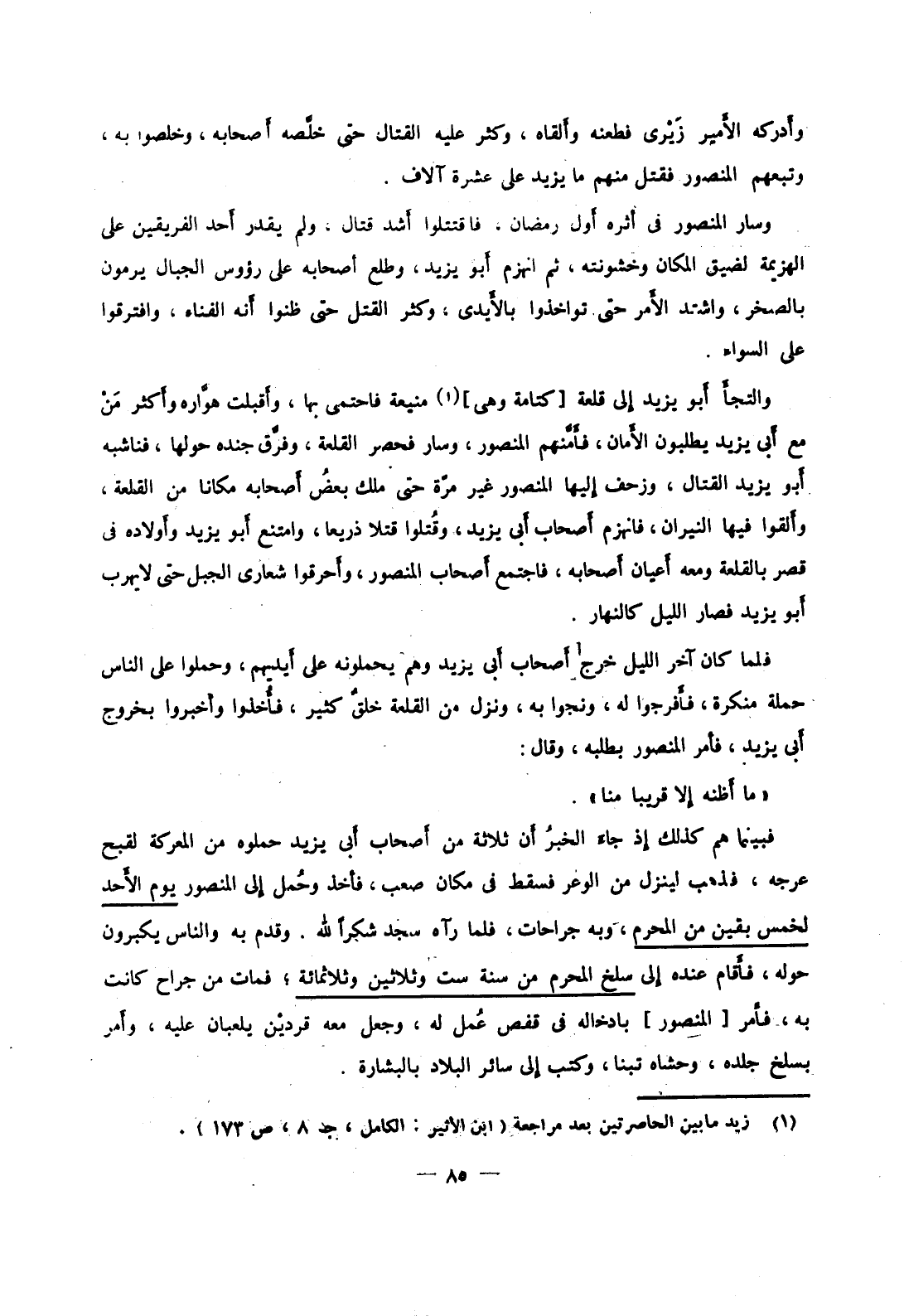 وسار المنصور في أثره أول رمضان، فاقتتلوا أشد قتال، ولم يقدر أحد الفريقين على الهزيمة لضيق المكان وخشونته، ثم انهزم أبو يزيد، وطلع أصحابه على رؤوس الجبال يرمون بالصخر، واشتد الأمر حتى تواخذوا بالأيدي، وكثر القتل حتى ظنوا أنه الفناء، وافترقوا على السواء.