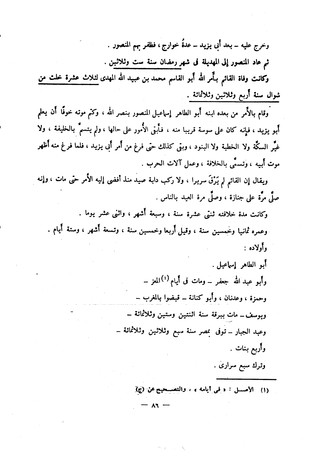 وأبو عبد الله جعفر ومات في أيام المعز وحمزة، وعدنان، وأبو كنانة قبضوا بالمغرب ويوسف مات ببرقة سنة اثنتين وستين وثلاثمائة وعبد الجبار توفي بمصر سنة سبع وثلاثين وثلاثمائة وأربع بنات.