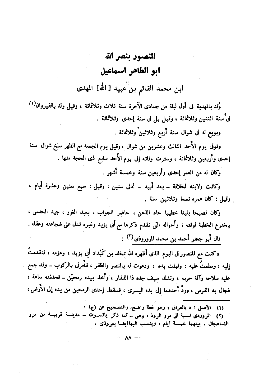 كنت مع المنصور في اليوم الذي أظهره الله بمخلد بن كيداد أبي يزيد، وهزمه، فتقدمت إليه، وسلمت عليه، وقبلت يده، ودعوت له بالنصر والظفر، فأمرني بالركوب وقد جمع عليه سلاحه وآلة حربه، وتقلد سيف جده ذا الفقار، وأخذ بيده رمحين فحدثته ساعة، فجال به الفرس، ورد أحدهما إلى يده اليسرى، فسقط إحدى الرمحين من يده إلى الأرض،