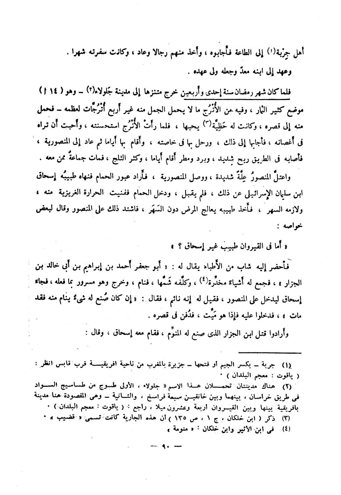 واعتل المنصور علة شديدة، ووصل المنصورية، فأراد عبور الحمام فنهاه طبيبه إسحاق ابن سليمان الإسرائيلي عن ذلك، فلم يقبل، ودخل الحمام ففنيت الحرارة الغريزية منه، ولازمه السهر، فأخذ طبيبه يعالج المرض دون السهر، فاشتد ذلك على المنصور وقال لبعض خواصه: أما في القيروان طبيب غير إسحاق؟ فأحضر إليه شاب من الأطباء يقال له: أبو جعفر أحمد بن إبراهيم بن أبي خالد بن الجزار، فجمع له أشياءً مخدرة، وكلفه شمها، فنام، وخرج وهو مسرور بما فعله، فجاء إسحاق ليدخل على المنصور، فقيل له إنه نائم، فقال: إن كان صنع له شيء ينام منه فقد مات، فدخلوا عليه فإذا هو ميت، فدفن في قصره.