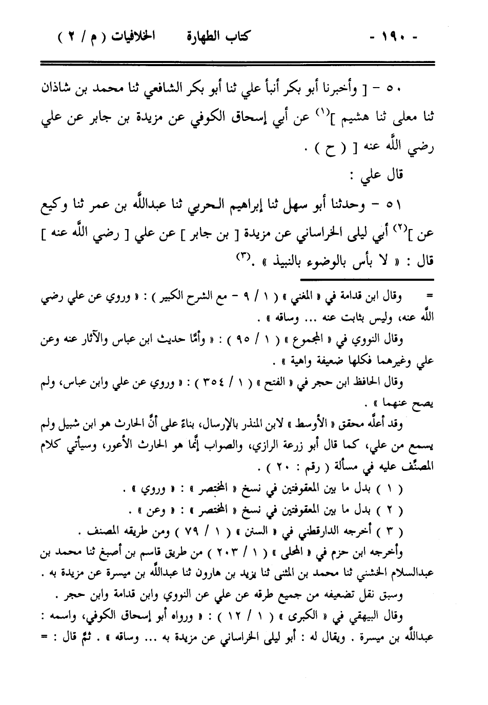 51- وحدثنا أبو سهل ثنا إبراهيم الحربي ثنا عبد الله بن عمر ثنا وكيع عن] أبي ليلى الخراساني عن مزيدة [بن جابر] عن علي [رضي الله عنه] قال: ((لا بأس بالوضوء بالنبيذ)).
