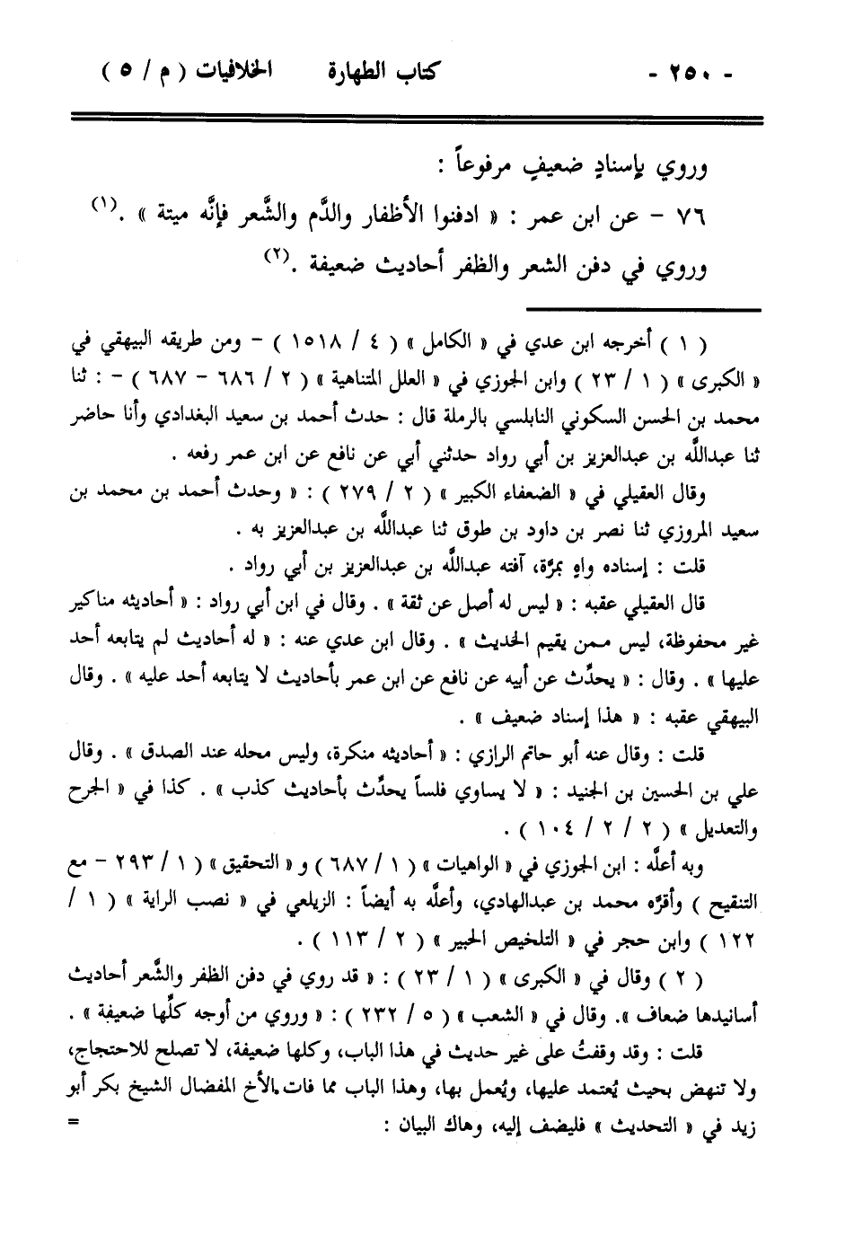 76- عن ابن عمر: ((ادفنوا الأظفار والدم والشعر فإنه ميتة)).