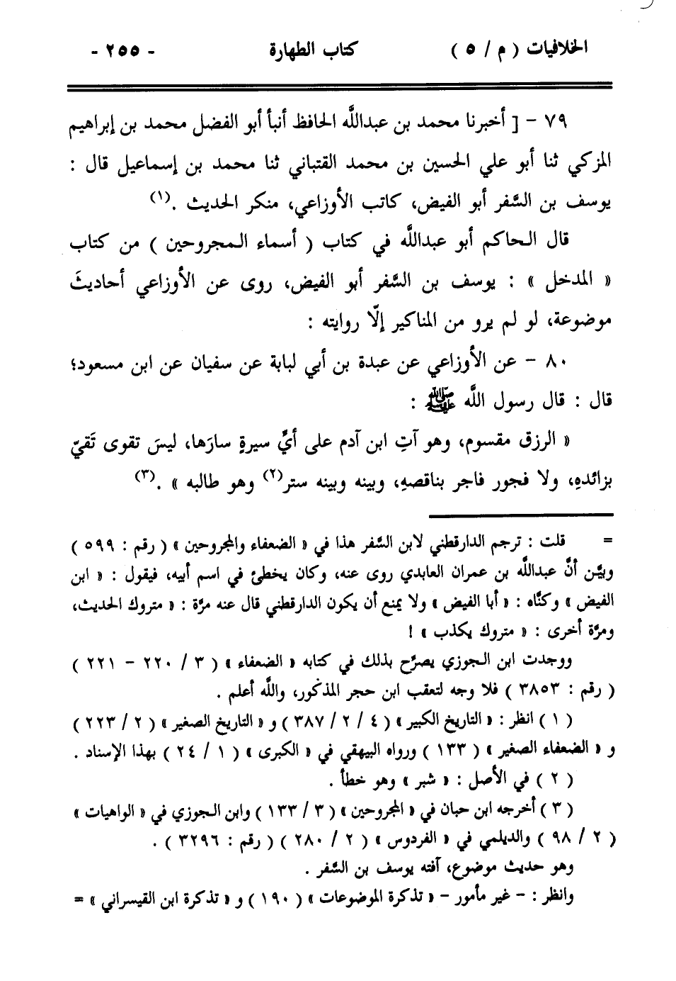79- [أخبرنا محمد بن عبد الله الحافظ أنبأ أبو الفضل محمد بن إبراهيم المزكي ثنا أبو علي الحسين بن محمد القتباني ثنا محمد بن إسماعيل قال: يوسف بن السفر أبو الفيض، كاتب الأوزاعي، منكر الحديث.