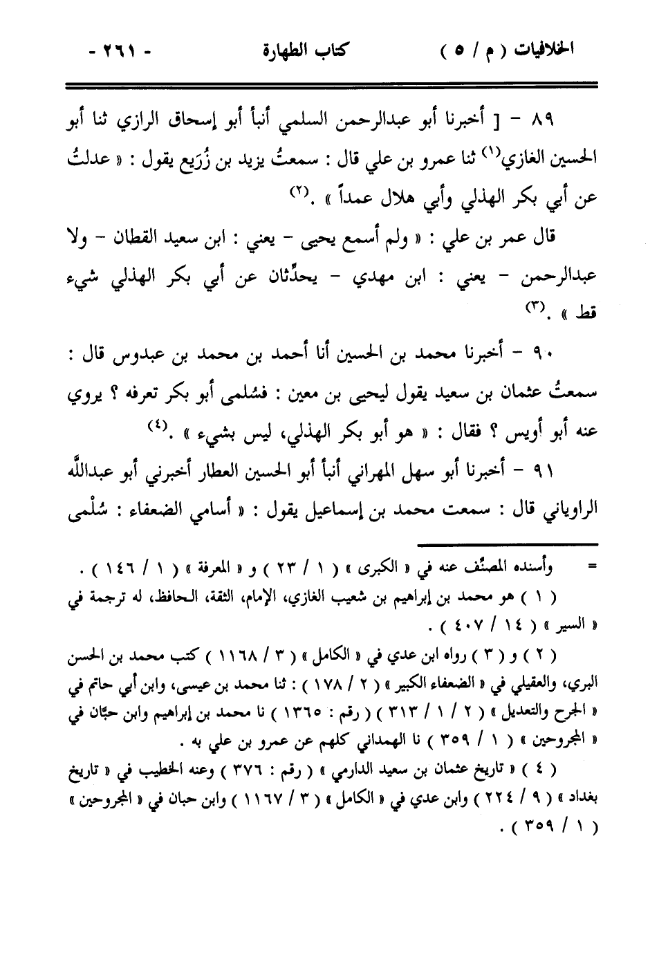 89- [أخبرنا أبو عبد الرحمن السلمي أنبأ أبو إسحاق الرازي ثنا أبو الحسين الغازي ثنا عمرو بن علي قال: سمعت يزيد بن زريع يقول: ((عدلت عن أبي بكر الهذلي وأبي هلال عمداً)).