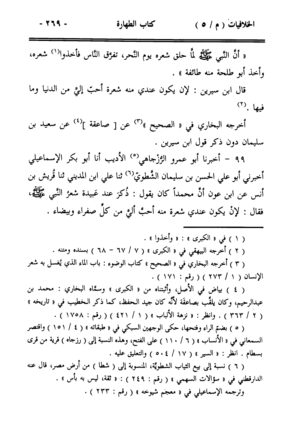 99- أخبرنا أبو عمرو الرزجاهي الأديب أنا أبو بكر الإسماعيلي أخبرني أبو علي الحسن بن سليمان الشطوي ثنا علي ابن المديني ثنا قريش بن أنس عن ابن عون أن محمداً كان يقول: ذكر عند عبيدة شعر النبي صلى الله عليه وسلم ، فقال: لأن يكون عندي شعرة منه أحب ألي من كل صفراء وبيضاء.