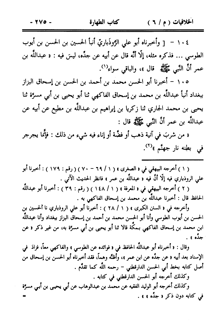 104- [وأخبرناه أبو علي الروذباري أنبأ الحسين بن الحسن بن أيوب الطوسي .. .. فذكره مثله، إلا أنه قال عن أبيه عن جده، ليس فيه: ((عبد الله بن عمر أن النبي صلى الله عليه وسلم قال))، والباقي سواء.