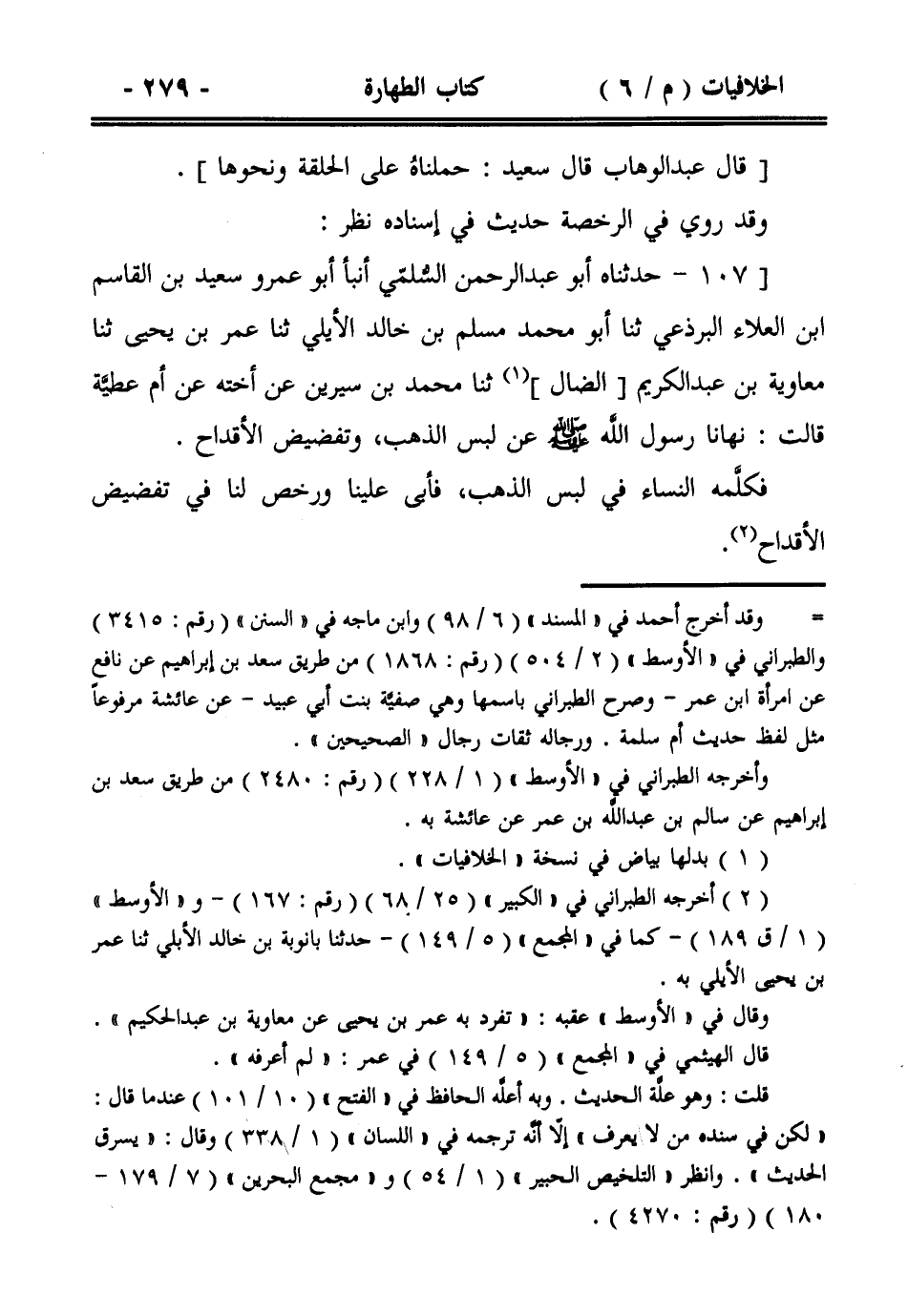 107- [حدثناه أبو عبد الرحمن السلمي أنبأ أبو عمرو سعيد بن القاسم ابن العلاء البرذعي ثنا أبو محمد مسلم بن خالد الأيلي ثنا عمر بن يحيى ثنا معاوية بن عبد الكريم [الضال] ثنا محمد بن سيرين عن أخته عن أم عطية قالت: نهانا رسول الله صلى الله عليه وسلم عن لبس الذهب، وتفضيض الأقداح.