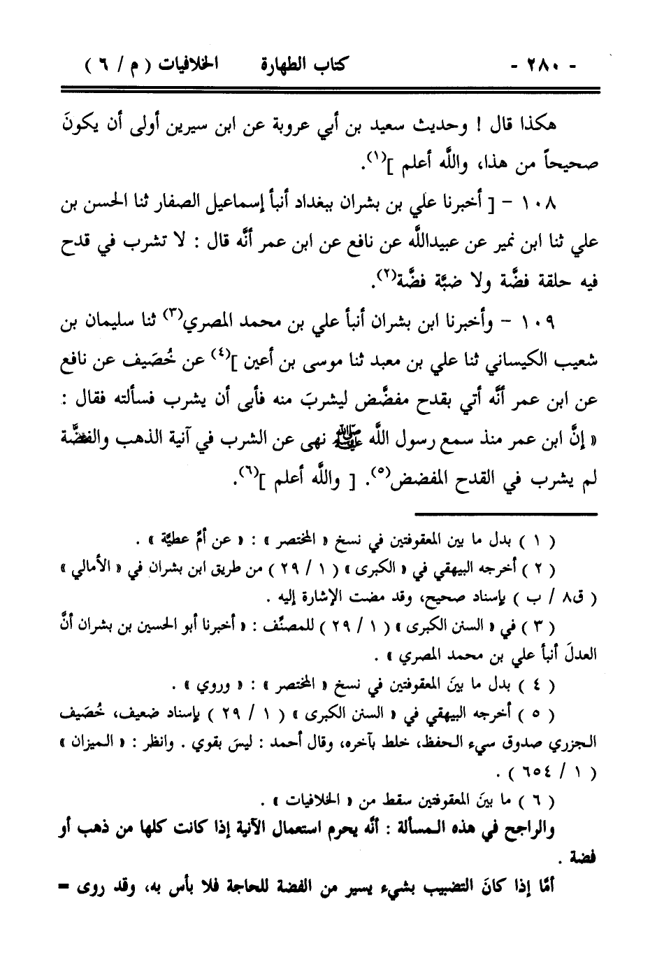 108- [أخبرنا علي بن بشران ببغداد أنبأ إسماعيل الصفار ثنا الحسن بن علي ثنا ابن نمير عن عبيد الله عن نافع عن ابن عمر أنه قال: لا تشرب في قدح فيه حلقة فضة ولا ضبة فضة.