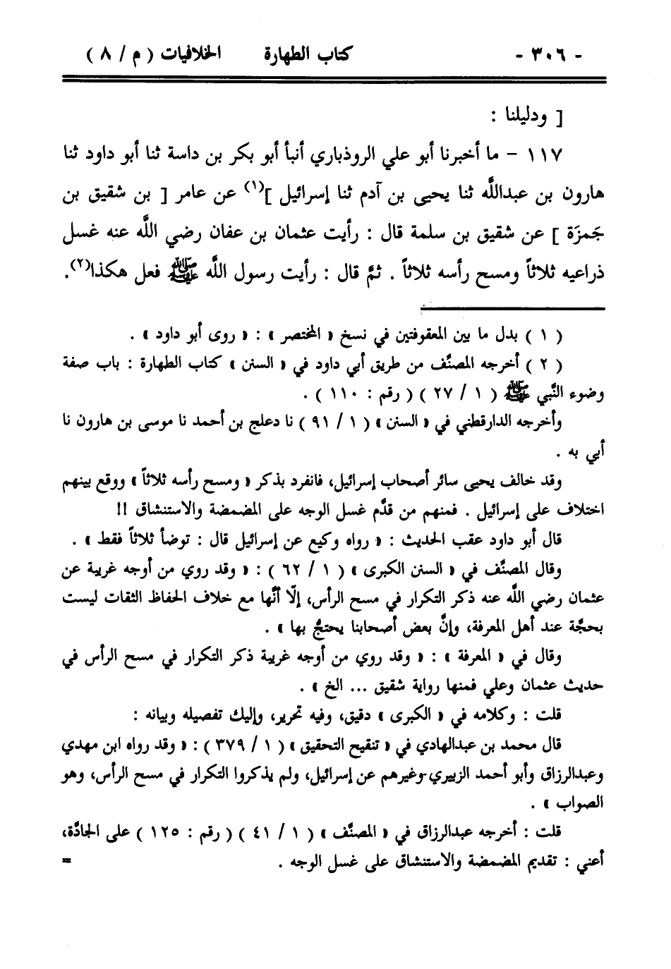 117- ما أخبرنا أبو علي الروذباري أنبأ أبو بكر بن داسة ثنا أبو داود ثنا هارون بن عبد الله ثنا يحيى بن آدم ثنا إسرائيل] عن عامر [بن شقيق بن جمزة] عن شقيق بن سلمة قال: رأيت عثمان بن عفان رضي الله عنه غسل ذراعيه ثلاثاً ومسح رأسه ثلاثاً. ثم قال: رأيت رسول الله صلى الله عليه وسلم فعل هكذا.