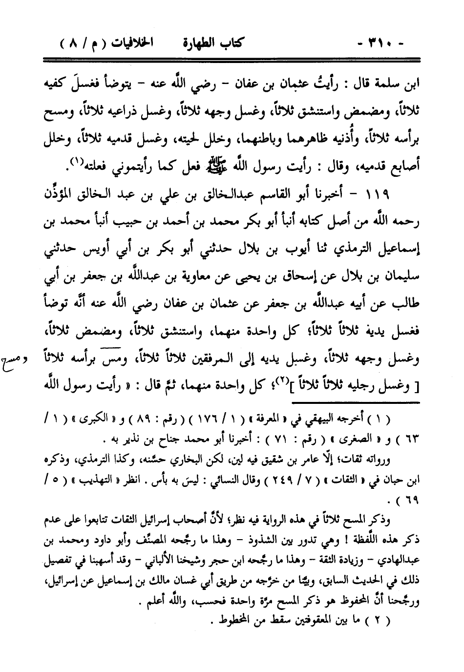 119- أخبرنا أبو القاسم عبد الخالق بن علي بن عبد الخالق المؤذن رحمه الله من أصل كتابه أنبأ أبو بكر محمد بن أحمد بن حبيب أنبأ محمد بن إسماعيل الترمذي ثنا أيوب بن بلال حدثني أبو بكر بن أبي أويس حدثني سليمان بن بلال عن إسحاق بن يحيى عن معاوية بن عبد الله بن جعفر بن أبي طالب عن أبيه عبد الله بن جعفر عن عثمان بن عفان رضي الله عنه أنه توضأ فغسل يديه ثلاثاً ثلاثاً؛ كل واحدة منهما، واستنشق ثلاثاً، ومضمض ثلاثاً، وغسل وجهه ثلاثاً، وغسل يديه إلى المرفقين ثلاثاً ثلاثاً، ومس برأسه ثلاثاً [وغسل رجليه ثلاثاً ثلاثاً]؛ كل واحدة منهما، ثم قال: ((رأيت رسول الله