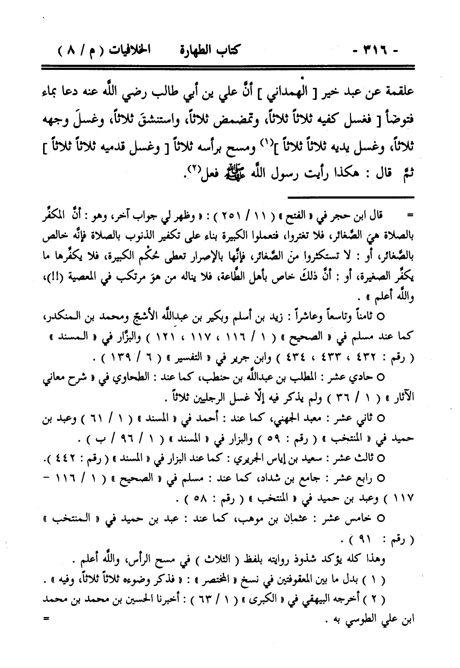 علقمة عن عبد خير [الهمداني] أن علي بن أبي طالب رضي الله عنه دعا بماء فتوضأ [فغسل كفيه ثلاثاً ثلاثاً، وتمضمض ثلاثاً، واستنشق ثلاثاً، وغسل وجهه ثلاثاً، وغسل يديه ثلاثاً ثلاثاً] ومسح برأسه ثلاثاً [وغسل قدميه ثلاثاً ثلاثاً] ثم قال: هكذا رأيت رسول الله صلى الله عليه وسلم فعل.