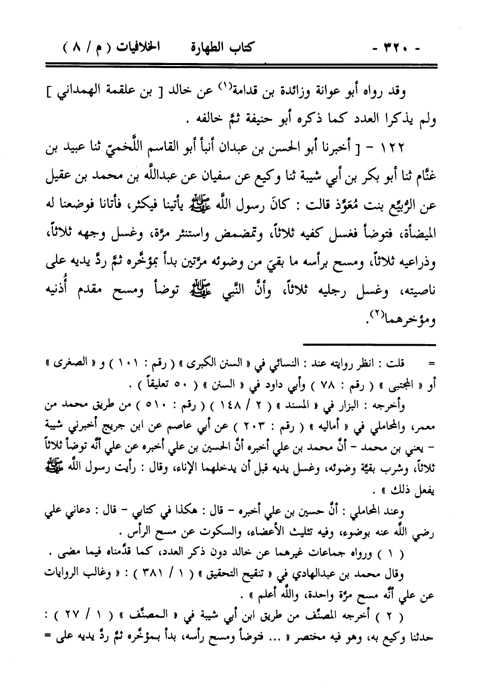 122- [أخبرنا أبو الحسن بن عبدان أنبأ أبو القاسم اللخمي ثنا عبيد بن غنام ثنا أبو بكر بن أبي شيبة ثنا وكيع عن سفيان عن عبد الله بن محمد بن عقيل عن الربيع بنت معوذ قالت: كان رسول الله صلى الله عليه وسلم يأتينا فيكثر، فأتانا فوضعنا له الميضأة، فتوضأ فغسل كفيه ثلاثاً، وتمضمض واستنثر مرة، وغسل وجهه ثلاثاً، وذراعيه ثلاثاً، ومسح برأسه ما بقي من وضوئه مرتين بدأ بمؤخره ثم رد يديه على ناصيته، وغسل رجليه ثلاثاً، وأن النبي صلى الله عليه وسلم توضأ ومسح مقدم أذنيه ومؤخرهما.