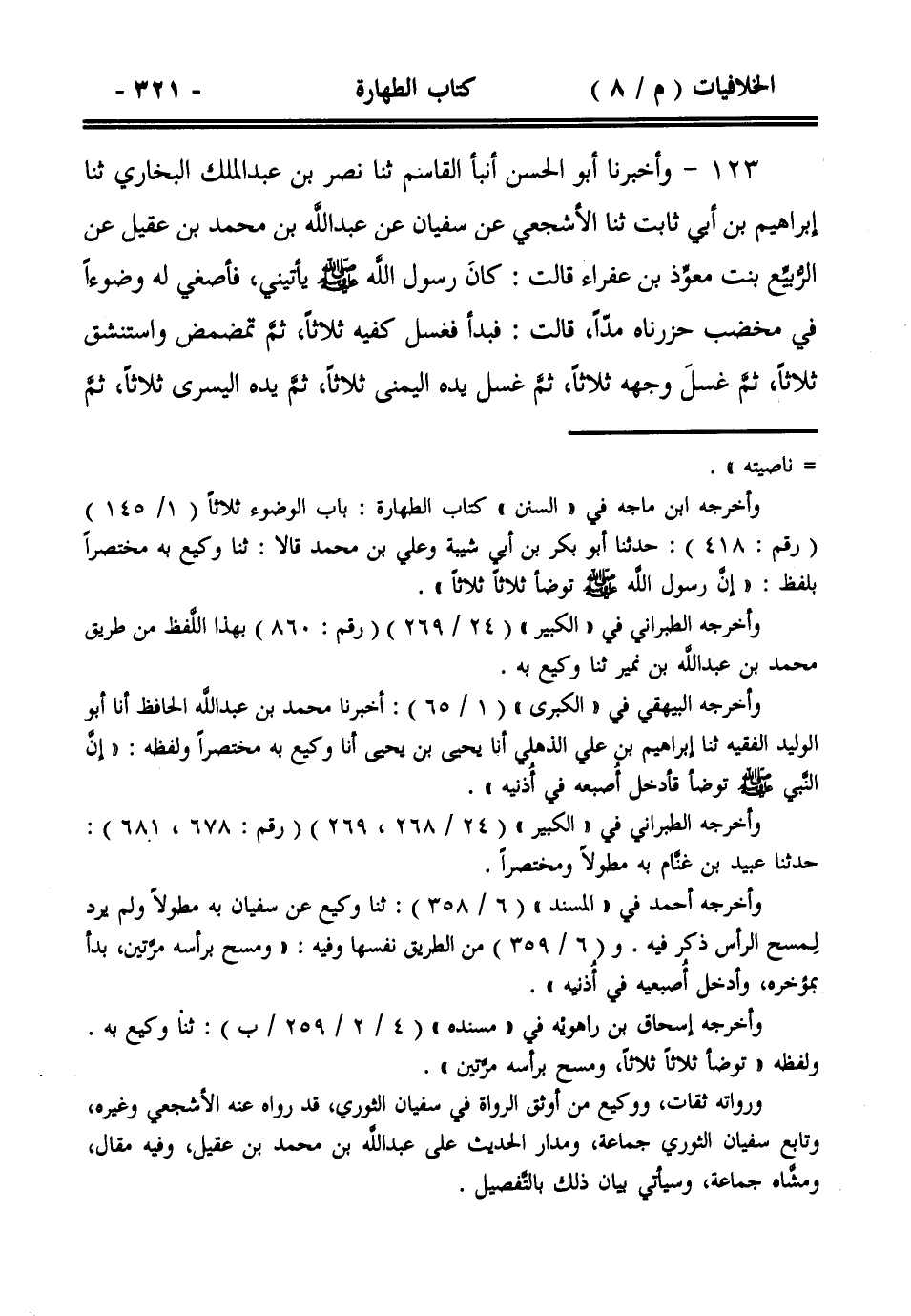123- وأخبرنا أبو الحسن أنبأ القاسم ثنا نصر بن عبد الملك البخاري ثنا إبراهيم بن أبي ثابت ثنا الأشجعي عن سفيان عن عبد الله بن محمد بن عقيل عن الربيع بنت معوذ بن عفراء قالت: كان رسول الله صلى الله عليه وسلم يأتيني، فأصغي له وضوءاً في مخضب حزرناه مداً، قالت: فبدأ فغسل كفيه ثلاثاً، ثم تمضمض واستنشق ثلاثاً، ثم غسل وجهه ثلاثاً، ثم غسل يده اليمنى ثلاثاً، ثم يده اليسرى ثلاثاً، ثم