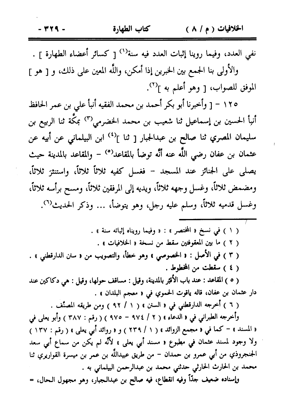 125- وأخبرنا أبو بكر أحمد بن محمد الفقيه أنبأ علي بن عمر الحافظ أنبأ الحسين بن إسماعيل ثنا شعيب بن محمد الحضرمي بمكة ثنا الربيع بن سليمان المصري ثنا صالح بن عبد الجبار [ثنا] ابن البيلماني عن أبيه عن عثمان بن عفان رضي الله عنه أنه توضأ بالمقاعد -والمقاعد بالمدينة حيث يصلى على الجنائز عند المسجد- فغسل كفيه ثلاثاً ثلاثاً، واستنثر ثلاثاً، ومضمض ثلاثاً، وغسل وجهه ثلاثاً، ويديه إلى المرفقين ثلاثاً، ومسح برأسه ثلاثاً، وغسل قدميه ثلاثاً، وسلم عليه رجل، وهو يتوضأ، .. .. وذكر الحديث.
