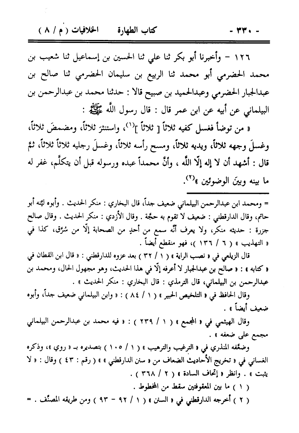 126- وأخبرنا أبو بكر ثنا علي ثنا الحسين بن إسماعيل ثنا شعيب بن محمد الحضرمي أبو محمد ثنا الربيع بن سليمان الحضرمي ثنا صالح بن عبد الجبار الحضرمي وعبد الحميد بن صبيح قالا: حدثنا محمد بن عبد الرحمن بن البيلماني عن أبيه عن ابن عمر قال: قال رسول الله صلى الله عليه وسلم :