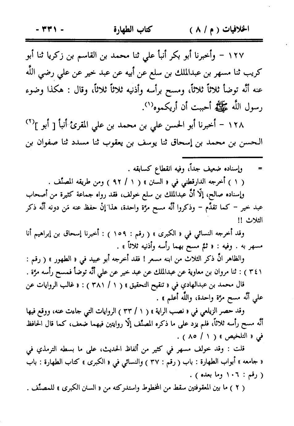 127- وأخبرنا أبو بكر أنبأ علي ثنا محمد بن القاسم بن زكريا ثنا أبو كريب ثنا مسهر بن عبد الملك بن سلع عن أبيه عن عبد خير عن علي رضي الله عنه أنه توضأ ثلاثاً ثلاثاً، ومسح برأسه وأذنيه ثلاثاً ثلاثاً، وقال: هكذا وضوء رسول الله صلى الله عليه وسلم أحببت أن أريكموه.