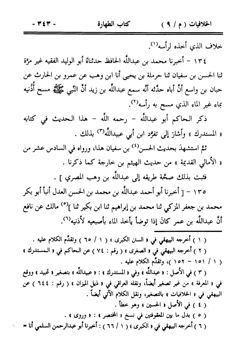 134- أخبرنا محمد بن عبد الله الحافظ حدثناه أبو الوليد الفقيه غير مرة ثنا الحسن بن سفيان ثنا حرملة بن يحيى أنا ابن وهب عن عمرو بن الحارث عن حبان بن واسع أن أباه حدثه أنه سمع عبد الله بن زيد أن النبي صلى الله عليه وسلم مسح أذنيه بماء غير الماء الذي مسح به رأسه.