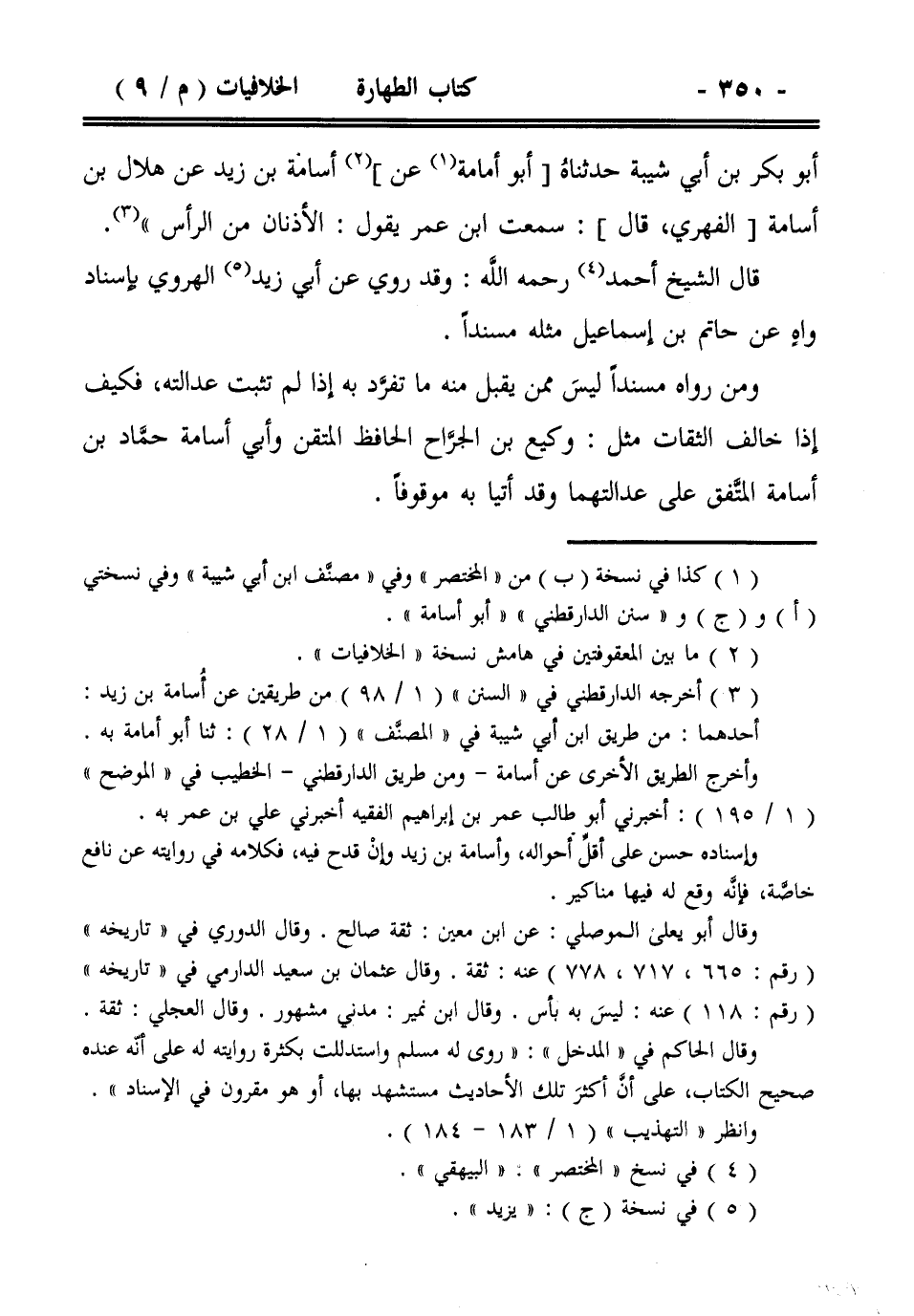 أبو بكر بن أبي شيبة حدثناه [أبو أمامة عن] أسامة بن زيد عن هلال بن أسامة [الفهري، قال]: سمعت ابن عمر يقول: الأذنان من الرأس)).