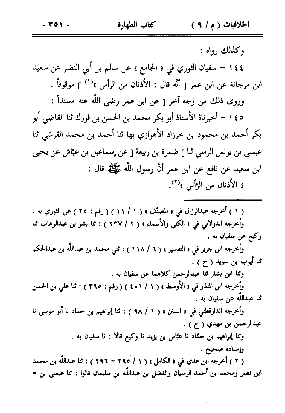 144- سفيان الثوري في ((الجامع)) عن سالم بن أبي النضر عن سعيد ابن مرجانة عن ابن عمر [أنه قال: الأذنان من الرأس))] موقوفاً.