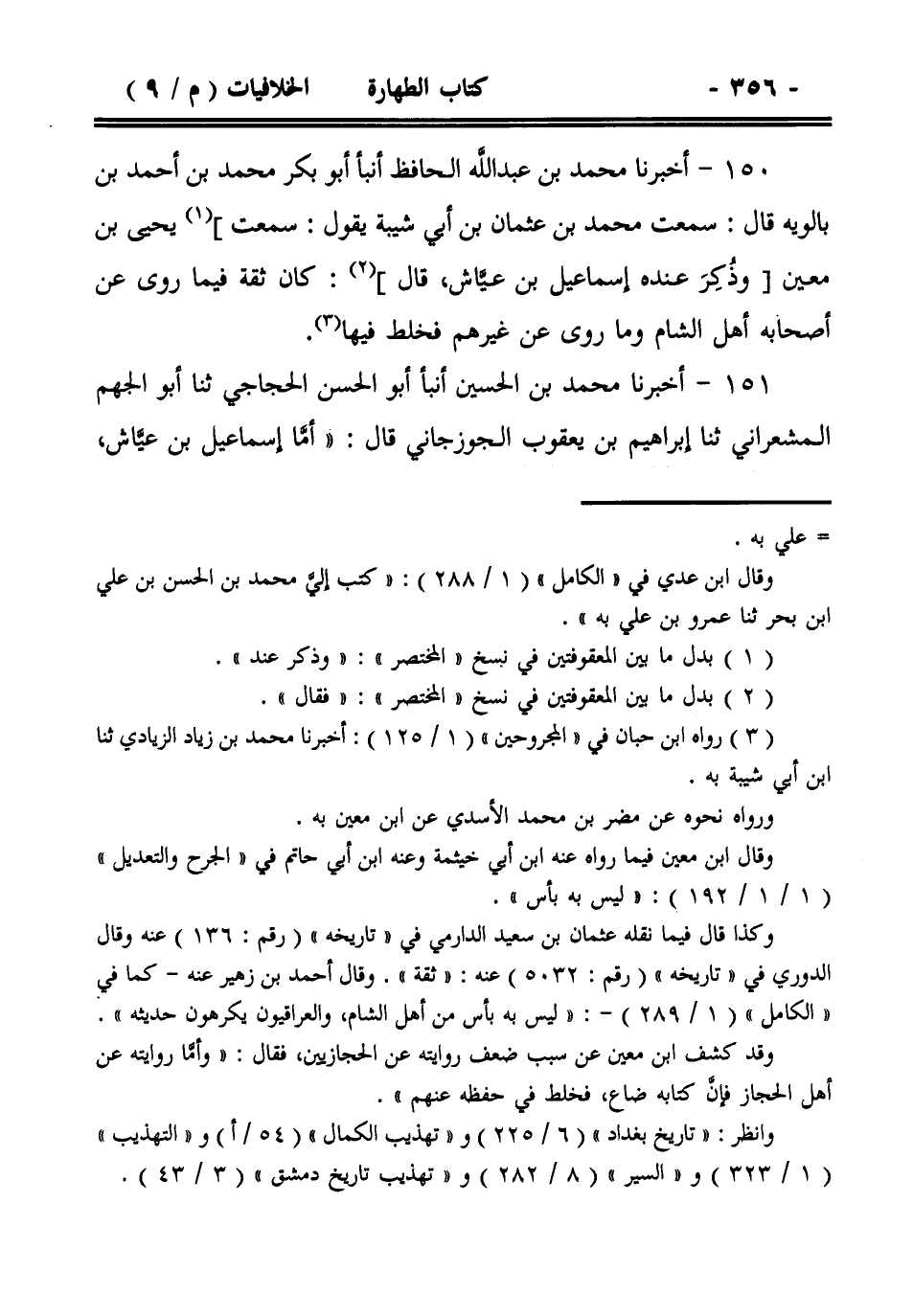 150- أخبرنا محمد بن عبد الله الحافظ أنبأ أبو بكر محمد بن أحمد بن بالويه قال: سمعت محمد بن عثمان بن أبي شيبة يقول: سمعت] يحيى بن معين [وذكر عنده إسماعيل بن عياش، قال]: كان ثقة فيما روى عن أصحابه أهل الشام وما روى عن غيرهم فخلط فيها.