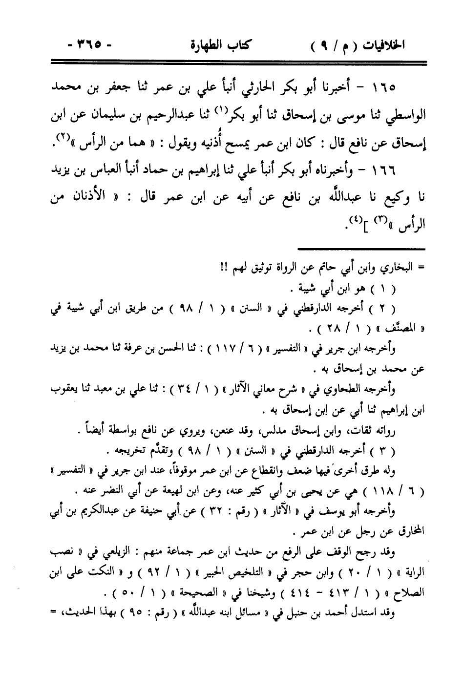 165- أخبرنا أبو بكر الحارثي أنبأ علي بن عمر ثنا جعفر بن محمد الواسطي ثنا موسى بن إسحاق ثنا أبو بكر ثنا عبد الرحيم بن سليمان عن ابن إسحاق عن نافع قال: كان ابن عمر يمسح أذنيه ويقول: ((هما من الرأس)).