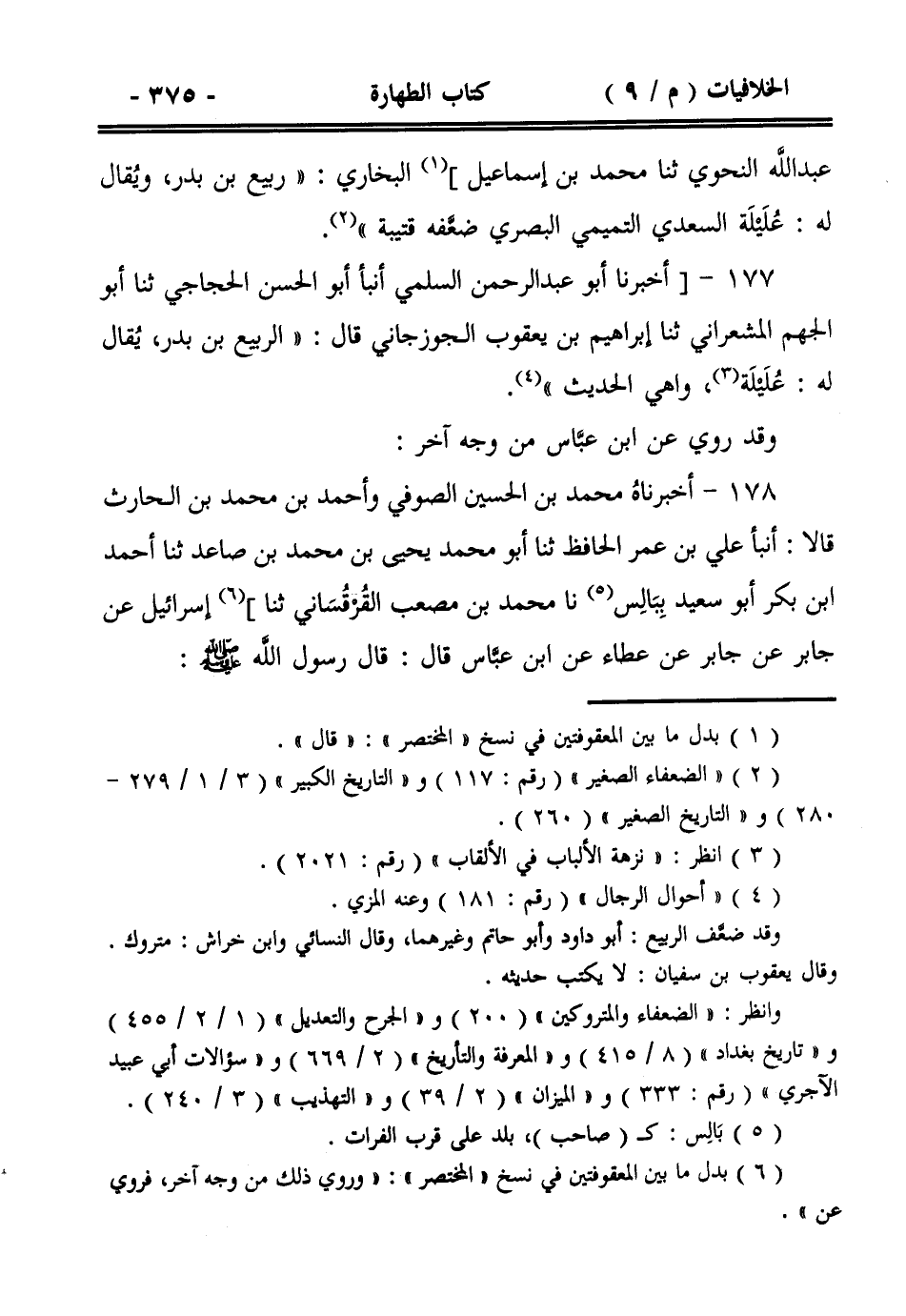 177- [أخبرنا أبو عبد الرحمن السلمي أنبأ أبو الحسن الحجاجي ثنا أبو الجهم المشعراني ثنا إبراهيم بن يعقوب الجوزجاني قال: ((الربيع بن بدر، يقال له: عليلة، واهي الحديث)).