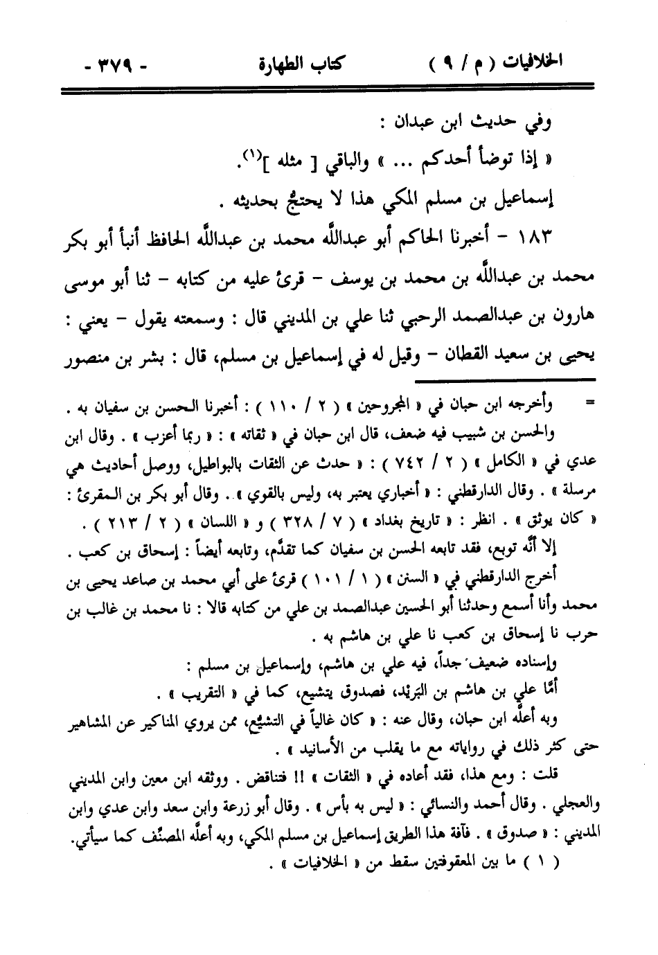 183- أخبرنا الحاكم أبو عبد الله محمد بن عبد الله الحافظ أنبأ أبو بكر محمد بن عبد الله بن محمد بن يوسف -قرئ عليه من كتابه- ثنا أبو موسى هارون بن عبد الصمد الرحبي ثنا علي بن المديني قال: وسمعته يقول -يعني: يحيى بن سعيد القطان- وقيل له في إسماعيل بن مسلم، قال: بشر بن منصور
