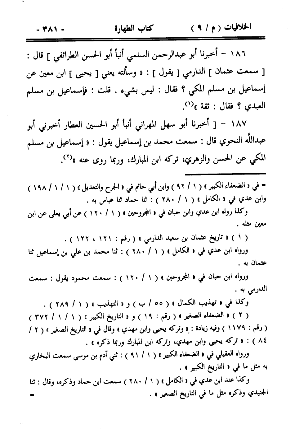 186- أخبرنا أبو عبد الرحمن السلمي أنبأ أبو الحسن الطرائفي] قال: [سمعت عثمان] الدارمي [يقول]: ((وسألته يعني [يحيى] ابن معين عن إسماعيل بن مسلم المكي؟ فقال: ليس بشيء. قلت: فإسماعيل بن مسلم العبدي؟ فقال: ثقة)).