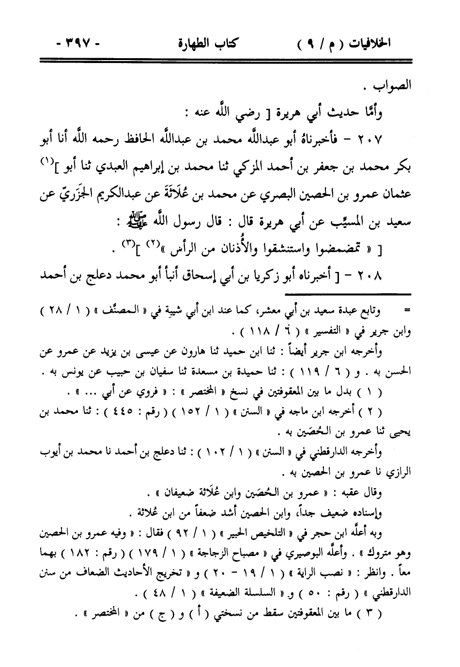 207- فأخبرناه أبو عبد الله محمد بن عبد الله الحافظ رحمه الله أنا أبو بكر محمد بن جعفر بن أحمد المزكي ثنا محمد بن إبراهيم العبدي ثنا أبو] عثمان عمرو بن الحصين البصري عن محمد بن علاثة عن عبد الكريم الجزري عن سعيد بن المسيب عن أبي هريرة قال: قال رسول الله صلى الله عليه وسلم :