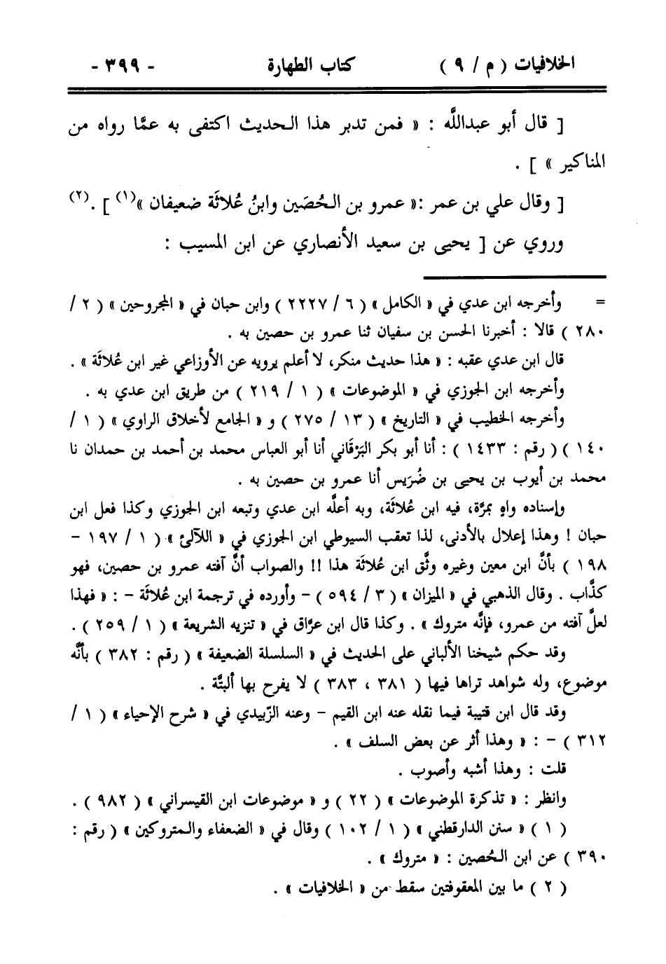 [وقال علي بن عمر: ((عمرو بن الحصين وابن علاثة ضعيفان))].
