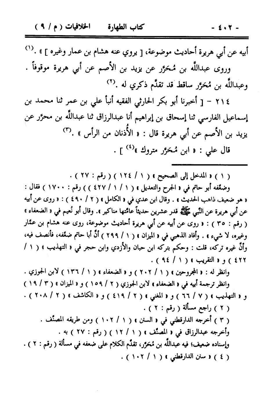 214- [أخبرنا أبو بكر الحارثي الفقيه أنبأ علي بن عمر ثنا محمد بن إسماعيل الفارسي ثنا إسحاق بن إبراهيم أنا عبد الرزاق ثنا عبد الله بن محرر عن يزيد بن الأصم عن أبي هريرة قال: ((الأذنان من الرأس)).