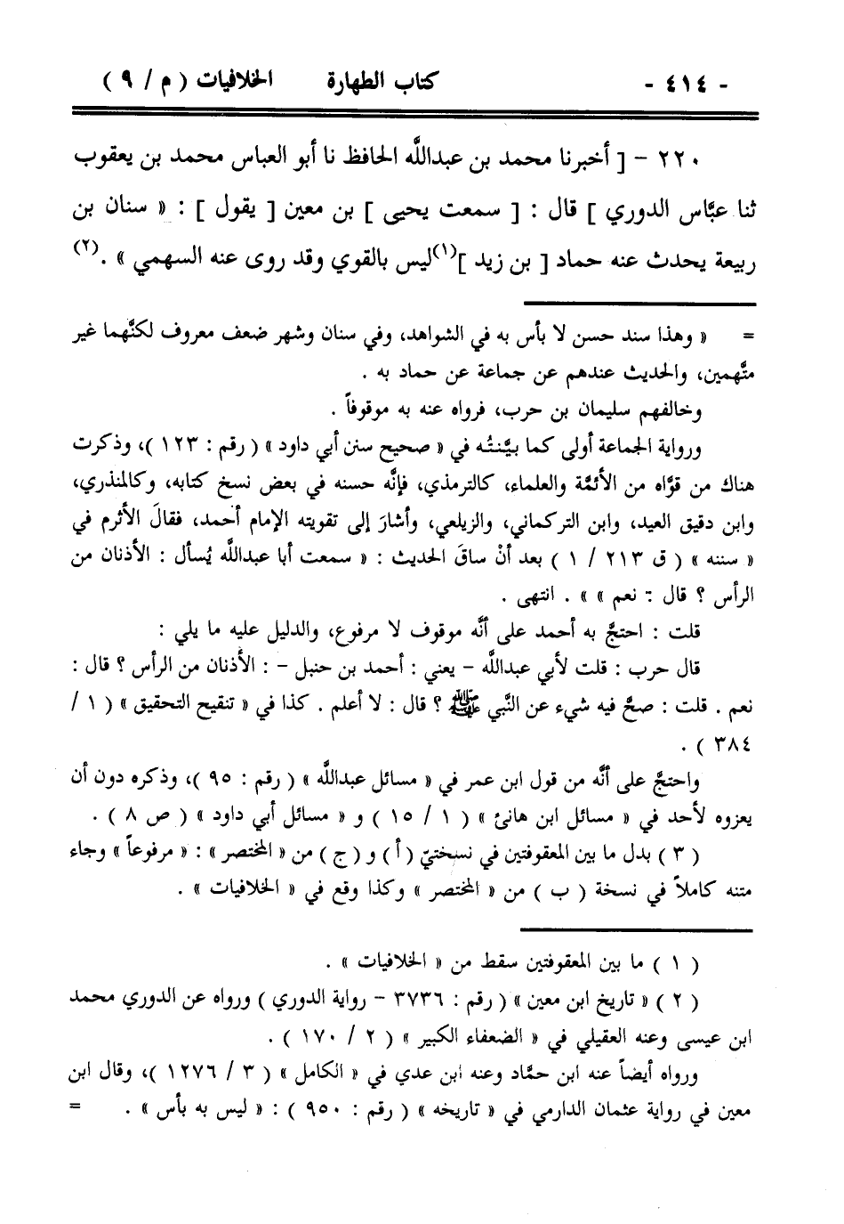 220- [أخبرنا محمد بن عبد الله الحافظ نا أبو العباس محمد بن يعقوب ثنا عباس الدوري] قال: [سمعت يحيى] بن معين [يقول]: ((سنان بن ربيعة يحدث عنه حماد [بن زيد] ليس بالقوي وقد روى عنه السهمي)).
