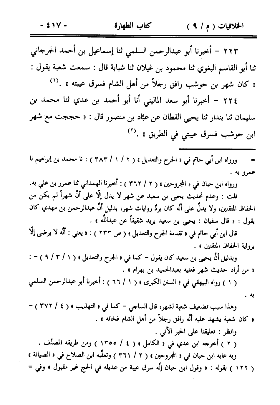 223- أخبرنا أبو عبد الرحمن السلمي ثنا إسماعيل بن أحمد الجرجاني ثنا أبو القاسم البغوي ثنا محمود بن غيلان ثنا شبابة قال: سمعت شعبة يقول: ((كان شهر بن حوشب رافق رجلاً من أهل الشام فسرق عيبته)).
