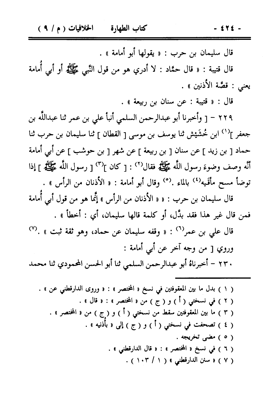 229- [وأخبرنا أبو عبد الرحمن السلمي أنبأ علي بن عمر ثنا عبد الله بن جعفر] ابن خشيش ثنا يوسف بن موسى [القطان] ثنا سليمان بن حرب ثنا حماد [بن زيد] عن سنان [بن ربيعة] عن شهر [بن حوشب] عن أبي أمامة أنه وصف وضوء رسول الله صلى الله عليه وسلم فقال: [كان] [رسول الله صلى الله عليه وسلم ] إذا توضأ مسح مأقيه بالماء. وقال أبو أمامة: ((الأذنان من الرأس)).