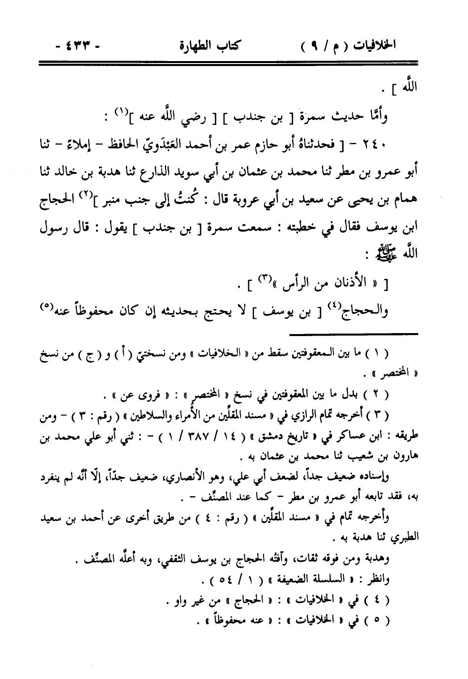 240- [فحدثناه أبو حازم عمر بن أحمد العبدوي الحافظ إملاء ثنا أبو عمرو بن مطر، ثنا محمد بن عثمان بن أبي سويد الذارع ثنا هدبة بن خالد ثنا همام بن يحيى عن سعيد بن أبي عروبة قال: كنت إلى جنب منبر] الحجاج ابن يوسف فقال في خطبته: سمعت سمرة [بن جندب] يقول: قال رسول الله صلى الله عليه وسلم :