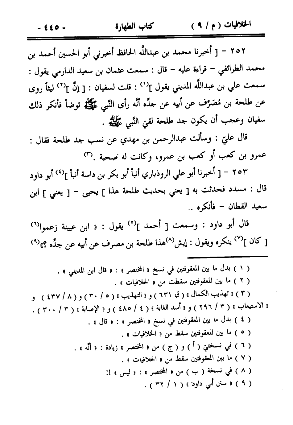 253- [أخبرنا أبو علي الروذباري أنبأ أبو بكر بن داسة أنبأ] أبو داود قال: مسدد فحدثت به [يعني بحديث طلحة هذا] يحيى -[يعني] ابن سعيد القطان- فأنكره..