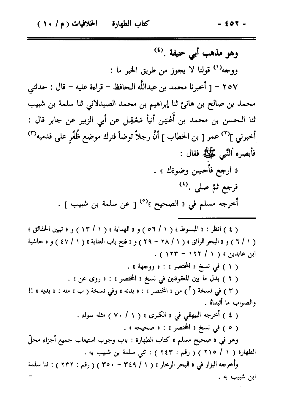 257- [أخبرنا محمد بن عبد الله الحافظ -قراءة عليه- قال: حدثني محمد بن صالح بن هانئ ثنا إبراهيم بن محمد الصيدلاني ثنا سلمة بن شبيب ثنا الحسن بن محمد بن أعين أنبأ معقل عن أبي الزبير عن جابر قال: أخبرني] عمر [بن الخطاب] أن رجلاً توضأ فترك موضع ظفرٍ على قدميه فأبصره النبي صلى الله عليه وسلم فقال: